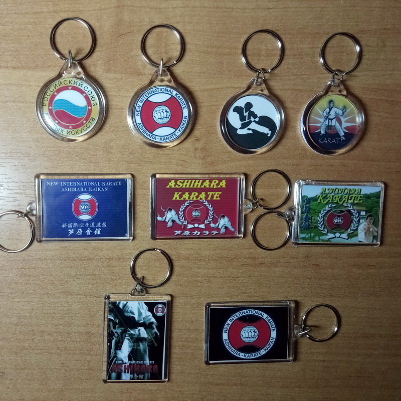 Брелок из прозрачного пластика (акрил) двусторонний, прямоугольные и круглые, с изображением различной символики ашихара карате (Асихара ). Размер брелка (внутренний) 5 х 3,5 см., круглого - 32,5 мм
