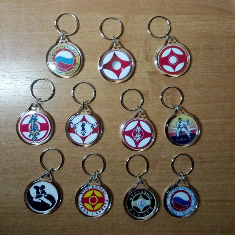 Изготавливаем подобные (ркуглые и прямоугольные) брелки с символикой карате, а также с логотипом Вашего клуба и даже с Вашей фотографией.