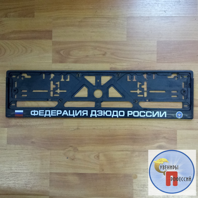 Рамка автомобильная под номер с надписью "федерация дзюдо" , белые буквы на чёрном фоне, слева флаг России, справа нанесена эмблема федерации.