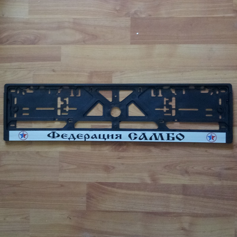 Рамка подномерная на автомобиль "федерация самбо", надпись на серебристом фоне чёрными буквами.