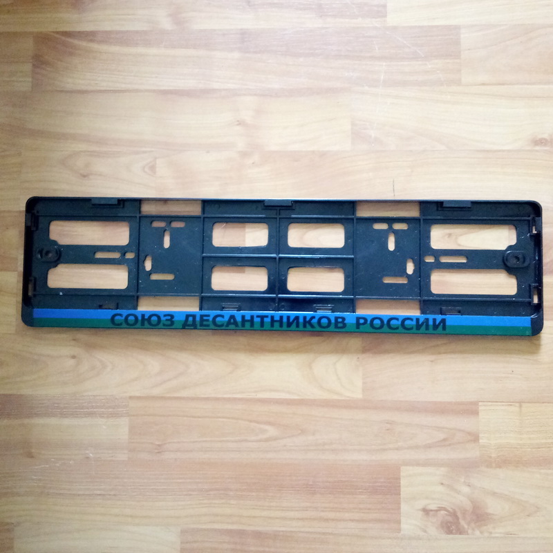 Рамка автомобильная под номер с нанесённой надписью Союз десантников России на фоне двухцветного флага десантников - сине-зелёного.