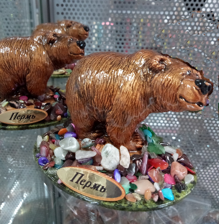 Композиция - медведь на уральском благородном камне змеевик и россыпь уральских самоцветов.